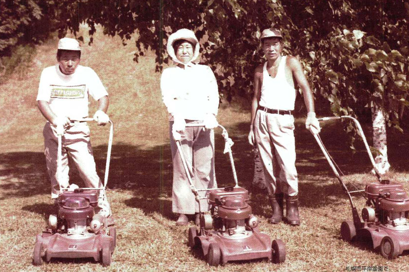 昭和49年5月、保護者の助言により、開設したての平和霊園へ試験的に石拾いなどの奉仕作業を始めたことが、その後の平岸霊園、宮丘公園、旧設墓地等の清掃管理作業へとつながりました。