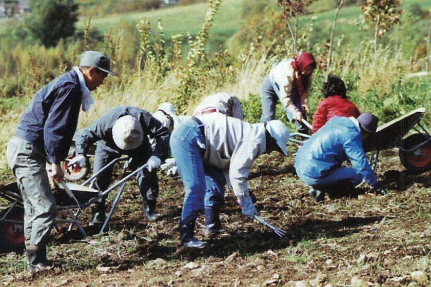 南区北ノ沢は昭和57年札幌市から訓練用地として6,000坪(現7,000坪)を無償貸与され、手稲この実寮の寮生と地域の方々の協力を得ながら開墾してきましたが、立派に北の沢農場として、色々な作物を育て収穫するまでになりました。
