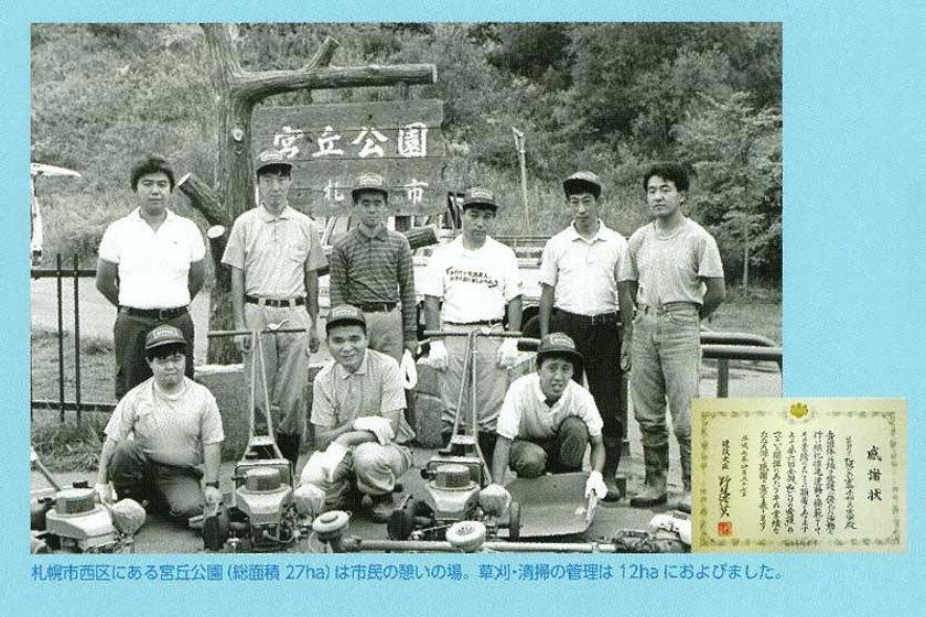 平成6年、グループホーム、生活寮、自主事業を各1か所ずつ増やし、時代に先がけ自主事業として西区・手稲区の在宅の仲間たちを含めた生活支援を行う「生活支援センター」を立ち上げました。この年から2名がアパート暮らしを始めま平成7年4月、緑の日を記念して、15年続けている宮丘公園清掃事業に対し建設大臣賞を受けました。これらの作業を通し、体力、働く意欲を高め、一般企業への就職にも繋がったのです。
